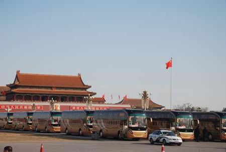 當(dāng)陽光普照在它們身上時,金燦燦的車身顏色再次使其成為兩會廣場上最絢麗耀眼的車隊,這就是服務(wù)今年兩會的22輛金旅客車XML6125J23 “開拓者”。