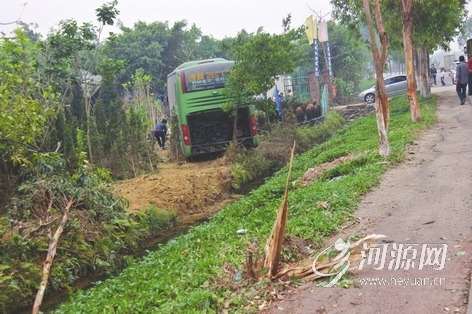 當記者趕到現(xiàn)場時,該客車仍停在花木場里面,而客車在205國道剎車時留下的十幾米長的痕跡顯而易見?;緢鲆幻ぷ魅藛T告訴記者,這輛客車是為了躲避一輛逆向行駛的小車,在剎車躲避不及的情況下大轉彎,沒想到卻撞到了路邊一位騎車經(jīng)過的老人。在撞傷人后,客車開過一條2米左右寬的溝沖進了花木場,將花木場的一些樹木撞得東倒西歪。據(jù)麻陂縣現(xiàn)場辦案民警介紹,被撞老人當場死亡,車上十多名乘客部分受傷,受傷乘客已被送往醫(yī)院治療。截至傍晚6時30分,客車上所有乘客已返回河源。