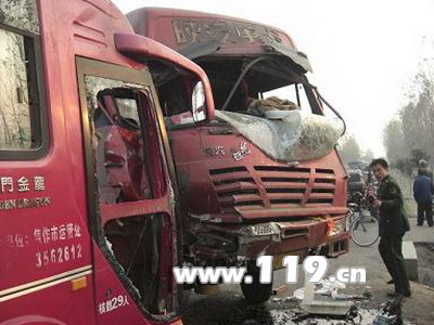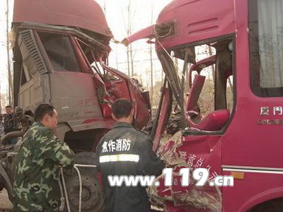 下午15時36分,溫縣消防部門接到群眾報警后,迅速出動2輛消防車、15名官兵趕往事故現(xiàn)場。到達現(xiàn)場后,呈現(xiàn)在官兵面前的是一幕觸目驚心的景象,破碎的汽車零部件撒了一地,地上到處流著柴油和汽油,斯太爾貨車車受損稍輕,副駕駛上的乘員被變型的駕駛室卡住右腳。大客車車體嚴重變型,駕駛員被卡在室內(nèi)座椅與方向盤之間,神志不清,傷情十分嚴重。由于車體扭曲,車門無法打開,5名乘客滯留在車內(nèi),情況十分危及。