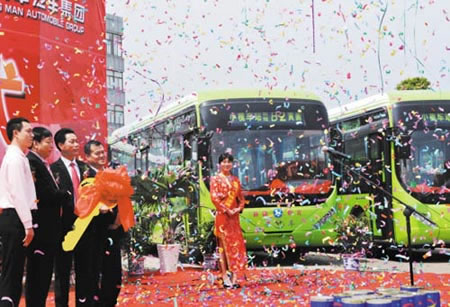 4月11日,在中國青年汽車集團大門口,18輛“青年”新車起程前往廣東省中山市。這是世界金融危機后,青年汽車集團新研發(fā)推向市場的一款9.5米低地板公交車。
