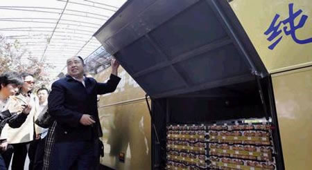 當日,一輛被改裝為純電動車的尼奧普蘭大型客車在北京亮相,20余家廠商和有關專家應邀參觀。這輛55座純電動大巴在行李艙內(nèi)安裝了由曹青山研發(fā)的兩排蓄電池組,充電1次客車可行駛600公里以上,最高時速可達120公里。兩排蓄電池組重約2噸,充放電次數(shù)可達1000次以上,壽命可達50萬公里。