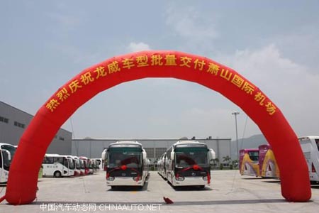 2009年6月17日下午,9輛大金龍龍威大客XMQ6129Y交付蕭山國際機(jī)場。交車慶祝儀式上,大金龍國內(nèi)銷售部經(jīng)理助理莊樹志和杭州蕭山國際機(jī)場汽運副總經(jīng)理虞錦立分別代表雙方致辭,并在掌聲和禮花中交接了象征攜手共贏、開創(chuàng)未來的金鑰匙。