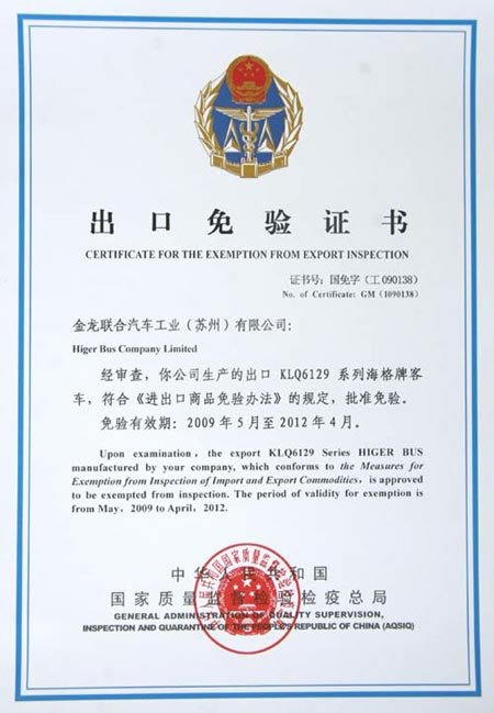 日前,蘇州金龍海格客車獲得國(guó)家出口免驗(yàn)資格,成為今年首批獲國(guó)家“出口免驗(yàn)”資格的產(chǎn)品?!皣?guó)家出口免驗(yàn)”資格是出口商品生產(chǎn)企業(yè)的最高榮譽(yù)。出口免驗(yàn)是國(guó)家質(zhì)檢總局貫徹以質(zhì)取勝戰(zhàn)略,鼓勵(lì)優(yōu)質(zhì)產(chǎn)品出口,促進(jìn)民族品牌拓展國(guó)際市場(chǎng),轉(zhuǎn)變外貿(mào)增長(zhǎng)方式,提高“中國(guó)制造”市場(chǎng)競(jìng)爭(zhēng)力的重要舉措,是國(guó)家授予出口企業(yè)的最高質(zhì)量榮譽(yù),代表了行業(yè)最高水平。獲得出口免驗(yàn)資格的企業(yè),在出口免驗(yàn)商品時(shí)免于檢驗(yàn),直接通關(guān)放行,不僅免交檢驗(yàn)費(fèi)用、節(jié)省通關(guān)時(shí)間和成本,還可享受檢驗(yàn)檢疫通關(guān)便捷措施。因此,國(guó)家對(duì)出口免驗(yàn)企業(yè)的準(zhǔn)入條件苛刻,要求高、標(biāo)準(zhǔn)嚴(yán)、控制緊,被認(rèn)為是目前各種質(zhì)量審查中最嚴(yán)格的一種審查,目前全國(guó)各行業(yè)獲得出口免驗(yàn)資格的企業(yè)僅100多家。
