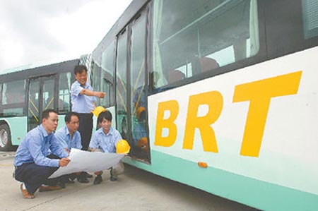 隨著市區(qū)城市交通道路的不斷完善,解放路BRT城市快速通道正日夜施工,將在下月通車。中大集團(tuán)根據(jù)城市交通發(fā)展需要,組織科研技術(shù)人員研制開發(fā)成功“中大牌”BRT城市快速大容量公交大巴,目前已上路試運行。圖為8月14日中大技術(shù)人員在對新研制的BRT快速公交車進(jìn)行車身外觀裝飾改進(jìn)。