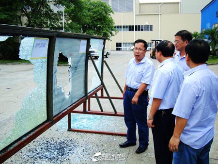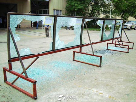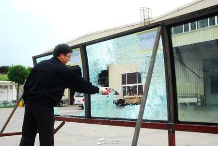 近日,廈門金旅公司在重視客車安全設(shè)計(jì)和制造的同時(shí),特別組織專業(yè)技術(shù)人員模擬客車發(fā)生險(xiǎn)情時(shí)的各種逃生試驗(yàn),其中一項(xiàng)為砸玻璃試驗(yàn),目的在于檢驗(yàn)安全錘應(yīng)砸在車窗玻璃的哪個(gè)位置,才能在遇險(xiǎn)時(shí)又快又有效地砸碎玻璃,安全逃離現(xiàn)場(chǎng)。當(dāng)天,在試驗(yàn)現(xiàn)場(chǎng)工作人員分別對(duì)著車窗玻璃的“安全出口”標(biāo)識(shí)、中間和邊緣處進(jìn)行敲擊試驗(yàn)。據(jù)技術(shù)中心孫秋林主任介紹說(shuō),車用玻璃一般使用特殊工藝制成的鋼化玻璃或中空玻璃,耐防撞,抗擊打。但若遇險(xiǎn),可用車內(nèi)配備的特制尖嘴安全錘砸向貼有“安全出口”標(biāo)識(shí)的玻璃逃生。通過(guò)驗(yàn)證,尖嘴安全錘只須重?fù)粲小鞍踩隹凇睒?biāo)識(shí)的車窗玻璃任何位置兩次就能使車窗玻璃破碎,然后用腳猛踹貼有“安全出口”標(biāo)識(shí)處,即可為乘客贏得逃生窗口,但需要注意的一點(diǎn)是貼有“安全出口”標(biāo)識(shí)的標(biāo)貼位置,玻璃因?yàn)槟z膜的原因,相對(duì)比較難以破碎。