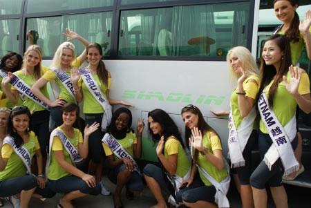 8月25日9時,2009國際旅游小姐車隊抵達制造二部,在熱烈的歡迎氛圍中,60余名國際佳麗款款下車,踏上紅地毯,走進少林客車。精心的布置、隆重的場面、熱情的人群讓佳麗們步入少林客車的一瞬間,就被少林人的真摯熱忱感動,不時向兩旁的歡迎人群揮手致意。
