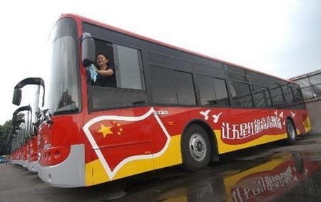 2009年8月31日,噴繪有五星紅旗圖案的公交車在寧波公交總公司亮相,并將投入運(yùn)營。為迎接國慶60周年,寧波市公交總公司在60輛全新公交車上噴繪“讓五星紅旗高高飄揚(yáng)”主題彩色圖案,將成為市區(qū)一道亮麗的風(fēng)景線。