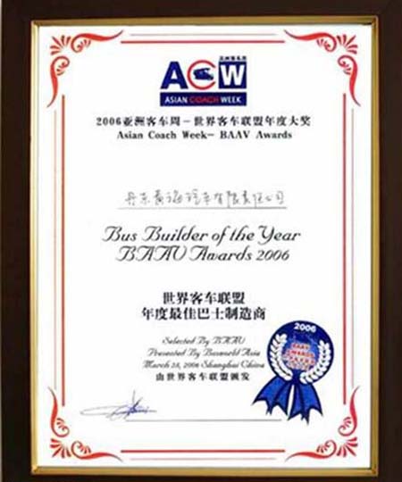 連續(xù)獲得世界客車聯(lián)盟亞洲客車周-BAAV年度大獎中的 “最佳巴士制造商”大獎。