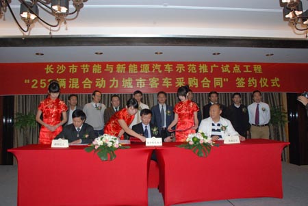 11月12日,長(zhǎng)沙市節(jié)能與新能源汽車示范推廣項(xiàng)目取得重大突破,湖南巴士公共交通有限公司、湖南龍?bào)J巴士有限責(zé)任公司與湖南南車時(shí)代電動(dòng)汽車股份有限公司簽訂了252臺(tái)混合動(dòng)力公交車采購(gòu)合同。這是長(zhǎng)沙市首次大規(guī)模批量采購(gòu)混合動(dòng)力城市客車,也是國(guó)家“十城千輛”新能源汽車推廣示范項(xiàng)目中最大的一筆訂單,對(duì)我國(guó)發(fā)展節(jié)能與新能源汽車產(chǎn)業(yè)具有重要意義。