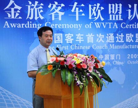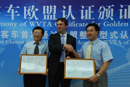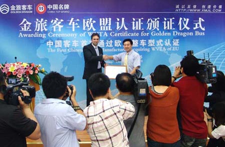 近日,金旅XML6937旅游客車(chē),XML6121城際交通車(chē)先后通過(guò)歐盟整車(chē)型式認(rèn)證,獲得WVTA證書(shū),廈門(mén)金旅因此成為中國(guó)首家獲得歐盟整車(chē)型式認(rèn)證證書(shū)的客車(chē)企業(yè)。2009年10月26日,金旅客車(chē)榮獲歐盟整車(chē)型式認(rèn)證證書(shū)的頒證儀式在廈門(mén)金旅公司隆重舉行,TüV德國(guó)萊茵中國(guó)集團(tuán)南中國(guó)區(qū)交通服務(wù)部總經(jīng)理Oliver Rothert特地到場(chǎng)祝賀,金旅公司葉宏廷總經(jīng)理等主要領(lǐng)導(dǎo)出席了頒證儀式。