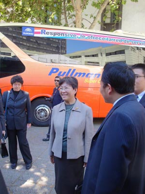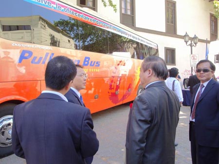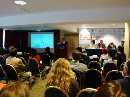 11月13日,在地球最南端的國家智利迎來了2009年(第七屆)中國汽車國際(南美)巡展首站啟動儀式。在智利首都圣地亞哥召開的中國汽車南美巡展新聞發(fā)布會及中智汽車研討會上,中國駐智利大使劉玉琴女士、中國機械工業(yè)聯(lián)合會副會長張小虞及智利國家商會、智利投資促進局等機構(gòu)的負(fù)責(zé)人參加了此次的發(fā)布會并致辭啟動第七屆“中國汽車國際(南美)巡展”。宇通客車企業(yè)代表與會發(fā)言,重點介紹了宇通近年來的快速發(fā)展、最新的電泳技術(shù)以及宇通海外市場發(fā)展的“3T”價值理念;并表示宇通客車愿意與當(dāng)?shù)氐暮献骰锇椤吧罨斫?,尋求合作發(fā)展”,為智利的公共交通做出自己的努力和貢獻。