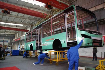 上午9時眾嘉賓在中通客車公司參加了現(xiàn)場觀摩會和整車裝車儀式,現(xiàn)場考察了LCK6103HG底架式全承載車身,這輛10米長樣車的全承載涂裝車身和裝有公交普及型專用空氣懸架的前后橋總成,以及節(jié)能型動力總成,是集中通三項專利于一身的產(chǎn)品。眾嘉賓現(xiàn)場主要考察了LCK6103HG裝專用空氣懸架的前后車橋總成及動力總成,前后車橋總成裝車工藝過程,并對整車進(jìn)行稱重。