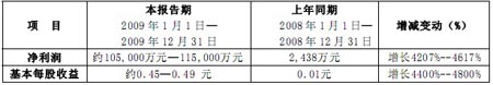 2、根據(jù)公司財務部門初步估算, 公司2009年度合并凈利潤為約10.5—11.5億元。