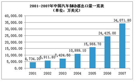 隨著制動器及ABS在華量產體制的不斷鞏固,相關產品開始向海外出口。來自中國海關總署的數(shù)據顯示,2007年制動器出口額增至3.4億美元,相當于2001年出口額的7倍。2007年,ABS出口額比2003年增長了49.5%,增至946萬美元。