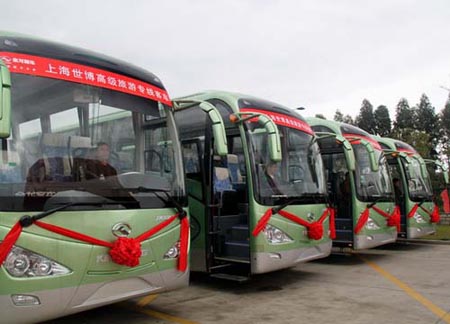 據(jù)官方估計,上海世博會期間,將有超過7000萬的觀眾從世界各地奔赴上海參觀園區(qū),這一巨大的數(shù)字背后意味著對上海交通保障的巨大挑戰(zhàn)。根據(jù)《上海世博會交通保障方案》預(yù)測,2010年上海市全市出行量將突破5000萬人次/日,為此上海市世博會籌辦工作領(lǐng)導(dǎo)小組交通組做出了周密部署,提出了“整體保障、突出世博”的總體原則和“倡導(dǎo)公交出行、均衡客流,適當(dāng)管制”的基本策略,為了緩解外地游客進(jìn)入園區(qū)的交通壓力,世博期間,將開通16條直達(dá)專線,20條大展專線和6條軌道交通接駁線。作為上海世博會最大的交通服務(wù)機(jī)構(gòu)之一,上海巴士公交公司除了承擔(dān)世博園區(qū)地面公交營運(yùn)任務(wù)以外,還負(fù)責(zé)部分直達(dá)專線運(yùn)營。為了增加運(yùn)力、提升客運(yùn)服務(wù)質(zhì)量,上海巴士公交公司面向全國知名客車制造商公開招標(biāo)直達(dá)專線車輛,在此次招標(biāo)中,大金龍以76輛的中標(biāo)結(jié)果榮登眾多投標(biāo)企業(yè)之首。據(jù)介紹,該批76輛豪華旅游客車中的56輛將投入世博直達(dá)專線運(yùn)營,承擔(dān)從F1賽車場至世博園區(qū)后灘的客流運(yùn)輸,其余20輛將作為公務(wù)用車,在園區(qū)中心區(qū)為世博組委會工作人員和公安警務(wù)人員提供服務(wù)。