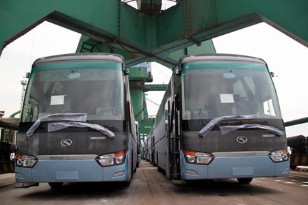 3月25日,經(jīng)廈門海關(guān)驗(yàn)放,40輛大金龍豪華旅游客車在廈門東渡碼頭整齊列隊(duì),陸續(xù)駛上滾裝船,即將駛往北非某國。據(jù)了解,這是大金龍與當(dāng)?shù)乜蛻粲诮衲?月簽訂的100輛客車訂單中的最后40輛,早在3月20日,該批訂單中的60輛公交車已經(jīng)在上海裝船,發(fā)往非洲。這也是自2005年以來,大金龍連續(xù)第6年向該國出口客車。目前大金龍累計(jì)出口到該國的客車已經(jīng)超過900輛,在中國客車企業(yè)中名列前茅。當(dāng)日,與這40輛旅游客車同時(shí)裝船的還有大金龍出口埃及的180輛輕型客車。