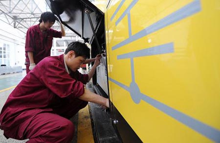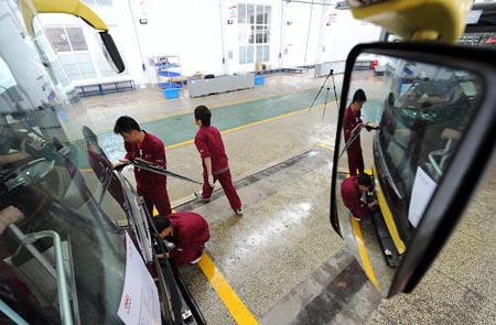 工人在對(duì)新型純電動(dòng)公交車進(jìn)行打氣泵檢測(cè)