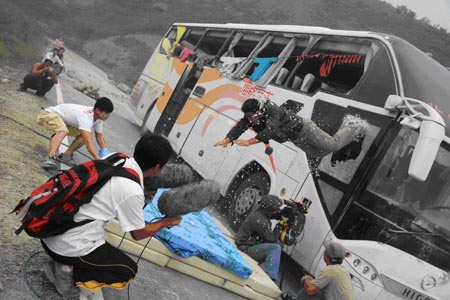 山清水秀的蜀道風(fēng)光,一段蜿蜒的山路,一輛俊秀的大客車。突然間,地動山搖,山體崩塌,巨石亂滾,司機(jī)被落石砸中,大巴失去控制,朝著山崖駛?cè)ァUf時遲那時快,男主人公一個箭步?jīng)_到駕駛席,一把打輪,車輛迅速駛離懸崖邊緣。隨后,男主角一腳急剎車,嘎的一聲,大客車穩(wěn)穩(wěn)地停在了路中間。