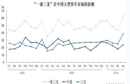 “三龍”與“一通”在中國大型客車市場的份額曾經(jīng)不相上下,但2009年2月至6月,宇通的份額持續(xù)超過蘇州金龍、大金龍、小金龍的份額之和。而從2009年7月開始至2010年4月的10個月,這一局面發(fā)生扭轉——“三龍”的份額持續(xù)高于宇通,即使在2009年12月二者份額接近時,也是“三龍”的份額(28.24%)高于宇通(28.19%)。