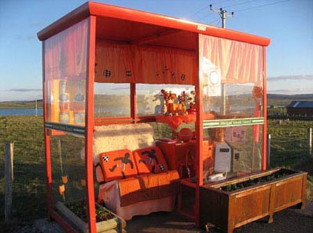 最初,是當(dāng)?shù)匾粦艟用駥㈤e置的沙發(fā)和桌子擺到了這個(gè)公交車站上,為它進(jìn)行了第一次“裝修”。之后越來(lái)越多的人為這個(gè)車站添置家具,大到電視機(jī),電腦,微波爐,小到鮮花和零食,使車站顯得越來(lái)越溫馨。