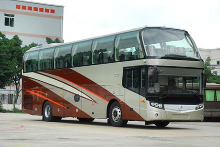 外觀造型簡潔大方,整體感覺高大威武而不失莊重動感,給人蓄勢待發(fā)之感。超大的上前額風擋同下前風擋玻璃相互對應,加上超大的側(cè)風窗及大而厚實的前后圍組合燈,有機的融合為一體。按高三級標準設(shè)計時最大座位數(shù)可達61座,行李倉容積11立方米左右,為旅客的出行及行李運輸提供了極大的方便。整車陰極電泳,保證十年不出現(xiàn)銹蝕穿孔,大幅度延長了整車的使用壽命。車身結(jié)構(gòu)采用金旅自主開發(fā)的全承載車身技術(shù)及封閉環(huán)式結(jié)構(gòu)形式的設(shè)計,大大提高了整車的強度和剛度。