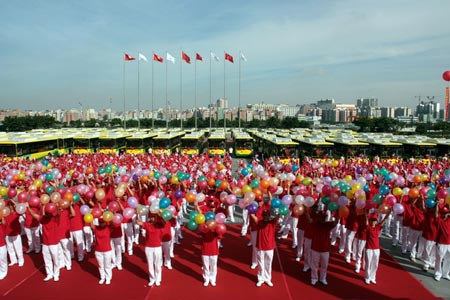 當(dāng)天上午10時,在白云國際會議中心,80輛嶄新的公交車整齊地排列著,威武雄壯、英姿颯爽。廣州市人大常委會副主任、總工會主席陳偉光,廣州市交通委員會主任冼偉雄,廣州三汽總經(jīng)理劉永勤,黨委書記麥福華,大金龍總經(jīng)理郭仁祥等領(lǐng)導(dǎo)和嘉賓參加了迎亞運(yùn)誓師大會,1000多名廣州三汽員工精神抖擻,用整齊劃一的動作為活動歡呼助興,并集體宣誓將用實(shí)際行動全力服務(wù)亞運(yùn),努力做到“創(chuàng)優(yōu)質(zhì)服務(wù)、當(dāng)文明標(biāo)兵”。