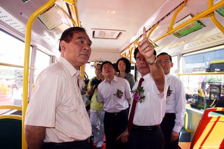 廣州市人大常委會副主任陳偉光(左)、廣州市交委主任洗偉(右)雄參觀大金龍清潔能源客車
