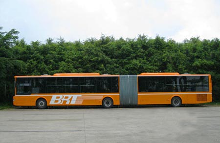 上午,筆者來到 “巨無霸”公交車試跑基地——廣州大學城,在公交汽車總站,筆者看到了簇新的橙黃色BRT公交車,車的后窗玻璃以及前門左側的車身上都涂上了大大的“BRT”公交標志?!熬逕o霸”的右半邊車身上,分前、中、后設置了3個車門,方便乘客上落車。車身部分也分為前后兩截,中間用圓形鋼盤和鉸鏈式塑膠管連成一體,前后兩截車廂分別長12米和6米。