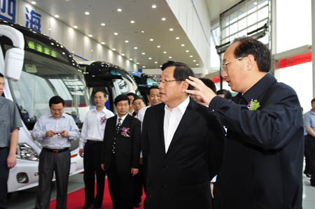 恒通客車執(zhí)行董事鄧平向科技部部長(zhǎng)萬(wàn)鋼介紹恒通新能源客車研發(fā)過程