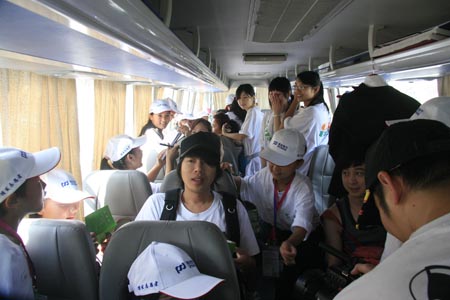 25日早上,參與活動(dòng)的海格大巴兵分?jǐn)?shù)路,前往各酒店迎接參加“明星帶你看世博”和“快樂(lè)全明星公益盛典”活動(dòng)的小朋友和嘉賓。其中一臺(tái)海格V92幸運(yùn)地得到了接送來(lái)自青海玉樹(shù)、新疆喀什的小朋友及偶像組合“水木年華”的任務(wù)。8時(shí)左右,身著統(tǒng)一服裝的玉樹(shù)和喀什的小朋友在志愿者帶領(lǐng)下登上了海格客車(chē)。一上車(chē)他們就好奇地在車(chē)內(nèi)打量著,并不時(shí)地向志愿者問(wèn)這問(wèn)那,一個(gè)藏族小朋友還認(rèn)真地調(diào)整了幾次頭頂?shù)目照{(diào)出風(fēng)口,說(shuō)這個(gè)比扇子涼快多了。