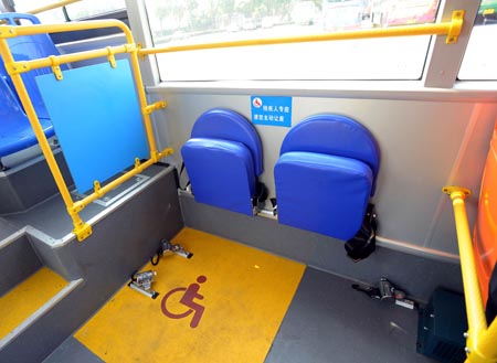 車內(nèi)正對(duì)后門的靠窗區(qū)域便是殘疾人專用位置,設(shè)有兩個(gè)可翻動(dòng)的座椅,沒有殘疾輪椅車時(shí),放下座椅供一般乘客使用;一旦有殘疾輪椅車上車時(shí),座椅翻起,車廂地板上有四個(gè)固定扣件,拉開保險(xiǎn)拉伸環(huán)扣固定殘疾輪椅車,然后從一旁工具箱中取出安全帶給殘疾人系上,坐在輪椅上的殘疾人就不用擔(dān)心車輛剎車等帶來的危險(xiǎn)。