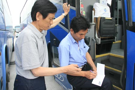 王少杰在世博停車場與外地的海格客車駕駛員交流溝通
