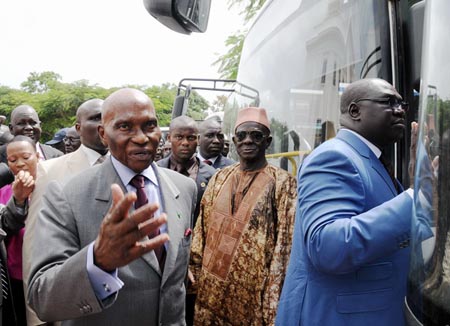 塞內(nèi)加爾總統(tǒng)瓦德(左)在交接儀式上參觀金龍公交客車