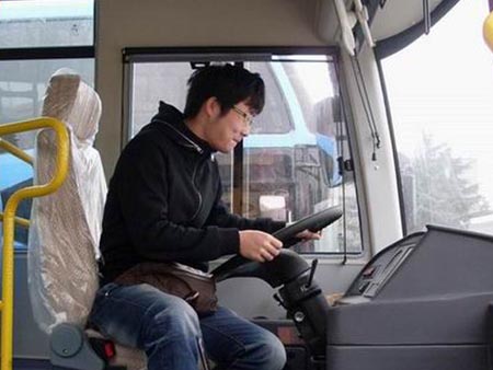 “印象河南”采訪團(tuán)記者忍不住上去感受一下駕駛宇通的客車,駕駛夠?qū)I(yè)吧!