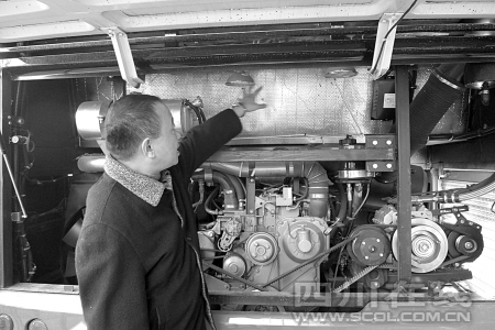 “整個(gè)滅火系統(tǒng)分成兩部分,車廂內(nèi)是一套,車尾還有一套。”陳曉剛打開公交車尾部車蓋,3個(gè)紅色干粉滅火器置身于復(fù)雜的發(fā)動(dòng)機(jī)系統(tǒng)中。
