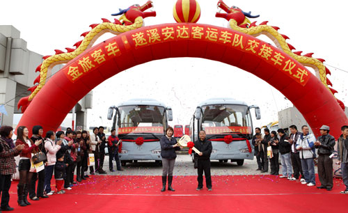 2011年1月4日上午,一排整齊的身披大紅花的金旅XML6807中型豪華客車有序地排列在金旅海滄大客生產(chǎn)廠區(qū)內(nèi),廠區(qū)外則是一派鑼鼓升天、禮炮齊鳴的熱鬧景象,這是“金旅客車—遂溪安達客運車隊交接車儀式”的現(xiàn)場。遂溪安達客運車隊(以下簡稱“遂溪安達客運”)王廣如總經(jīng)理、王廷芳副總經(jīng)理以及廈門金旅銷售公司曹穎副總經(jīng)理等領(lǐng)導(dǎo)和嘉賓出席了此次交接車儀式。
