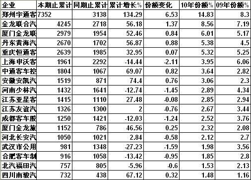 2010年1-11月,公交客車銷量前五名企業(yè)分別為鄭州宇通、蘇州金龍、廈門金龍、丹東黃海和重慶恒通,其中增幅最高的企業(yè)為鄭州宇通,累計增幅達(dá)134.29%,市場份額與同期相比提高了6.53個百分點。