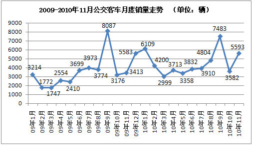 從09年1月以來各月份公交客車月度銷量走勢來看,今年市場總體走勢與去年基本一致,但各月份銷量普遍高于同期水平,然而與整個商用車市場的火爆程度相比,公交客車市場的表現(xiàn)相對低迷。