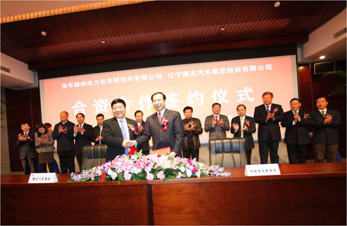 1月6日,我國最大的新能源汽車電傳統(tǒng)系統(tǒng)供應(yīng)商和最早的客車制造商走到一起。在多位國家部委、地方政府官員和眾多媒體記者的共同見證下,南車株洲電力機(jī)車研究所有限公司(以下簡稱“南車株洲所”)與遼寧曙光汽車集團(tuán)股份有限公司在北京正式簽訂合資合作協(xié)議,共同打造新能源客車航母,做國內(nèi)最大的新能源客車產(chǎn)業(yè)化研發(fā)和制造基地。其中,南車株洲所隸屬于我國央企電動車產(chǎn)業(yè)聯(lián)盟16個發(fā)起企業(yè)中的中國南車股份有限公司(以下簡稱“中國南車”),曙光汽車集團(tuán)則是國內(nèi)公交客車市場領(lǐng)先企業(yè)丹東黃海汽車有限責(zé)任公司的母公司。