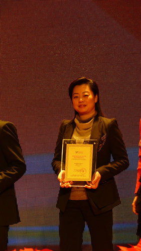 恒通客車(chē)高層領(lǐng)導(dǎo)雷燕代表公司領(lǐng)取“2011年度海外市場(chǎng)推薦車(chē)型”獎(jiǎng)(新威龍CKZ6127CH3)