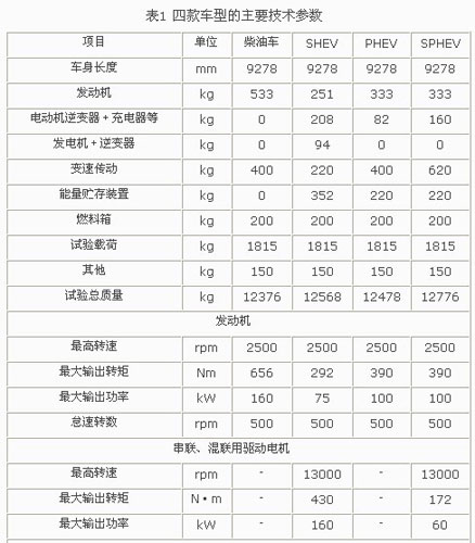 用于測試的4款車型的主要技術(shù)參數(shù)如表1所示。其中,SHEV為串聯(lián)式混合動力,PHEV為并聯(lián)式混合動力,SPHEV為混聯(lián)式混合動力。