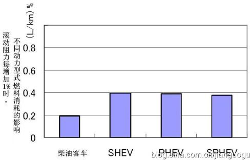 大型客車在城市工況下滾動(dòng)阻力系數(shù)變化對(duì)燃料消耗的影響如圖1所示??v軸為滾動(dòng)阻力系數(shù)增加1%時(shí),柴油車與其他3種混合動(dòng)力形式每公里燃料消耗(L/km)的對(duì)比情況。