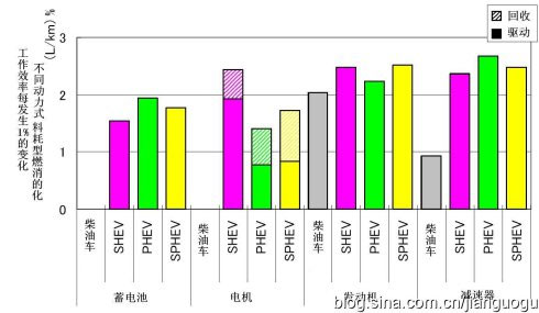 縱軸為各主要總稱每公里燃料消耗的影響。車輪電機(jī)驅(qū)動(dòng)主要用于串聯(lián)和混聯(lián)方式。車輪驅(qū)動(dòng)有減速器和差速器兩級(jí)傳動(dòng),這里的車輪驅(qū)動(dòng)為一級(jí)傳動(dòng),傳動(dòng)效率有所提高并減少了后橋的質(zhì)量。