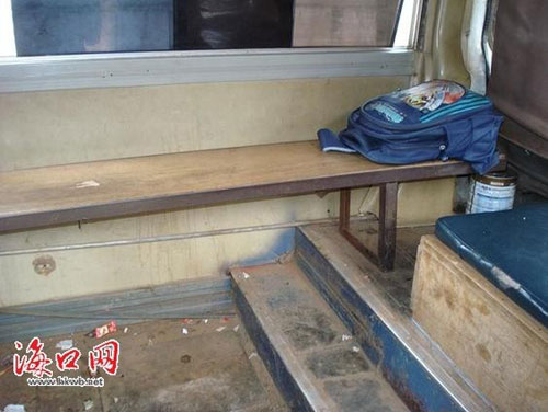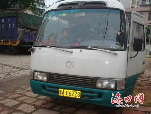 3月31日上午,市行評(píng)員來(lái)到位于海榆中線的??趪?guó)中學(xué)校,看到校內(nèi)停放著三輛中巴車(chē),車(chē)牌號(hào)為瓊A19291和瓊A23985兩輛車(chē)的車(chē)身印有“海口國(guó)中學(xué)校學(xué)生接送車(chē)”的字樣,最后一輛車(chē)牌號(hào)為瓊A19637的車(chē)輛則在車(chē)頭前放著“小天才幼兒園”的牌子。前兩輛“校車(chē)”已經(jīng)略顯“破舊”,不僅沒(méi)有校車(chē)專用標(biāo)識(shí)和座位安全帶,而且座椅已經(jīng)很破舊,連木長(zhǎng)凳都用上了,車(chē)頭儀表臺(tái)更是破舊不堪,電線老舊而外露,萬(wàn)一車(chē)輛發(fā)生電線短路著火,這一車(chē)的孩子如何逃生?