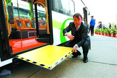 “它還被業(yè)內(nèi)人士稱為能‘跳舞’的公交車(chē)?!睂<腋嬖V記者,不僅車(chē)體能整體升降,車(chē)身還能傾斜,就像跳舞聳肩膀一樣。駕駛員可以通過(guò)調(diào)整車(chē)身一側(cè)的氣囊高度來(lái)實(shí)現(xiàn)公交車(chē)向一側(cè)傾斜。這其實(shí)也是為了照顧殘疾乘客而專門(mén)設(shè)計(jì)的人性化功能。車(chē)身傾斜后,就可以抽出公交車(chē)后門(mén)的輪椅踏步,給坐輪椅的殘疾人提供一架幾乎沒(méi)有坡度的“梯子”。這樣,殘疾人自己就可以輕松地上下車(chē)。隨后,駕駛員樓師傅演示了電公交車(chē)向一側(cè)傾斜的過(guò)程。記者看到,他輕輕一按按鈕,車(chē)身就可以升降和傾斜,這個(gè)過(guò)程僅僅1分鐘,非常方便快捷。記者在車(chē)上發(fā)現(xiàn),電動(dòng)公交車(chē)還專門(mén)設(shè)立了殘疾人專座,殘疾人可以通過(guò)座椅兩邊的保險(xiǎn)帶來(lái)固定輪椅,從而可以大大減少乘車(chē)過(guò)程中的顛簸晃動(dòng)。