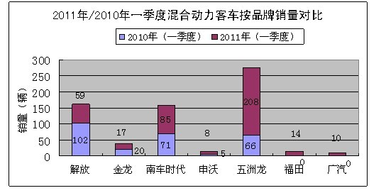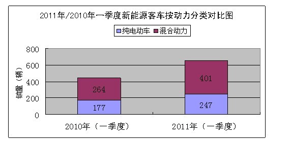 2011年一季度,新能源客車銷售648輛,其中純電動客車銷售247輛,混合動力客車銷售401輛,同比上年新能源客車441輛,純電動客車177輛,混合動力客車264輛,新能源客車、純電動客車和混合動力客車增長比例分別是:47%、40%和52%。混合動力客車比純電動客車增長速度比例超過12%充分表明,在當(dāng)前的主客觀因素制約條件下,混合動力客車比純電動客車更適合中國的國情,更受市場的青睞。