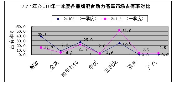 2011年一季度混合動力客車整體表現(xiàn)優(yōu)于純電動車,盡管國內(nèi)能生產(chǎn)混合動力客車的企業(yè)不少,但不少企業(yè)是噱頭,擺花架子,真正大規(guī)模市場化的可以說是捉襟見肘。發(fā)展最為強(qiáng)勁的當(dāng)數(shù)深圳五洲龍客車,無論是總銷量還是市場占有率都達(dá)到令人震撼的地步。今年一季度市場占有率達(dá)到51.9%,是銷量第二名的市場占有率的2倍,第三名的4倍以上,該規(guī)律絕對符合市場營銷中4:2:1份額定率。