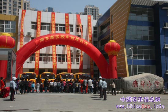 4月29日中午12時許,由宇通客車制造的4輛新款校車緩緩駛出鄭東新區(qū)康平小學的校門,值此鄭州市鄭東新區(qū)校車正式運行。