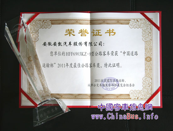 安凱尊榮AK9獲得“中國(guó)道路運(yùn)輸杯”最佳公路客車獎(jiǎng)