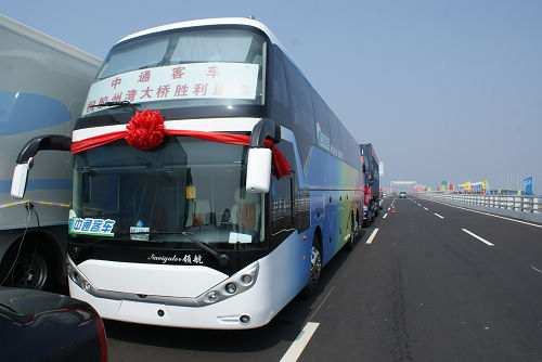 2011年6月30日,世界最長(zhǎng)的海上大橋----青島膠州灣大橋正式通車。宣布青島與黃島之間徹底結(jié)束了“盈盈一水間,脈脈不得語”百年交通難題,實(shí)現(xiàn)了“一橋飛架‘東西’,天塹變通途”的美好夢(mèng)想。大橋通車儀式現(xiàn)場(chǎng)山東省委書記、省人大常委會(huì)主任姜異康,山東省委副書記、省長(zhǎng)姜大明,海軍北海艦隊(duì)政委王登平,山東省委常委、副省長(zhǎng)王軍民等領(lǐng)導(dǎo)作了重要講話,中通作為大型客車的代表,派出公司的12米高端旅游大巴領(lǐng)航車型引領(lǐng)車隊(duì)通過大橋,受到了各級(jí)領(lǐng)導(dǎo)及廣大市民的熱烈關(guān)注和高度贊賞。
